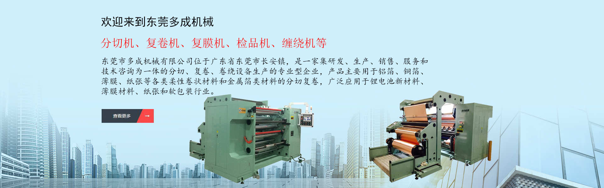 東莞市多成機(jī)械有限公司位于廣東省東莞市長(zhǎng)安鎮(zhèn),是一家集研發(fā)、生產(chǎn)、銷(xiāo)售、服務(wù)和技術(shù)咨詢(xún)?yōu)橐惑w的分切、復(fù)卷、卷繞設(shè)備生產(chǎn)的專(zhuān)業(yè)型企業(yè),產(chǎn)品主要用于鋁箔、銅箔、薄膜、紙張等各類(lèi)柔性卷狀材料和金屬箔類(lèi)材料的分切復(fù)卷,廣泛應(yīng)用于鋰電池新材料、薄膜材料、紙張和軟包裝行業(yè),產(chǎn)品范圍有分切機(jī)、復(fù)卷機(jī)、復(fù)膜機(jī)、檢品機(jī)、纏繞機(jī)等,是國(guó)內(nèi)外分切卷繞設(shè)備專(zhuān)業(yè)供應(yīng)商。